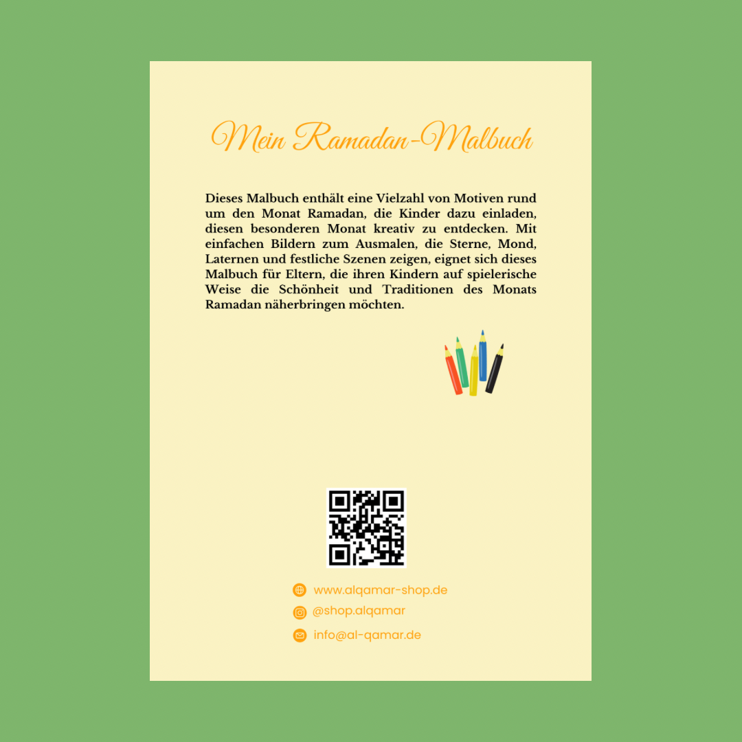 Dieses Malbuch enthält eine Vielzahl von Motiven rund um den Monat Ramadan, die Kinder dazu einladen, diesen besonderen Monat kreativ zu entdecken. Mit einfachen Bildern zum Ausmalen, die Sterne, Mond, Laternen und festliche Szenen zeigen, eignet sich dieses Malbuch für Eltern, die ihren Kindern auf spielerische Weise die Schönheit und Traditionen des Monats Ramadan näherbringen möchten.